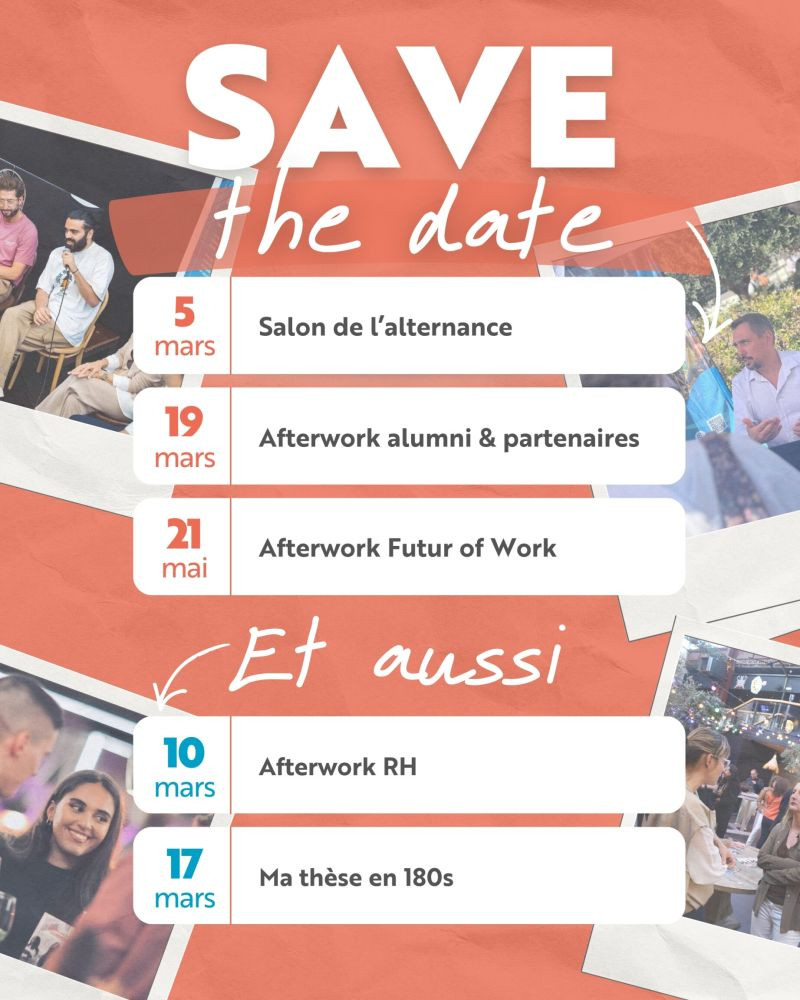 Le réseau alumni vous donne rendez-vous pour une série d’événements à venir dédiés aux échanges professionnels, au développement de collaborations et au partage d’expériences.Entreprises partenaires et diplômés, ces rencontres seront l’occasion de renforcer les liens, d’identifier de nouvelles opportunités et de valoriser les talents du réseau.Réservez dès à présent ces dates dans vos agendas. Les informations détaillées (programme, intervenants, modalités d’inscription) seront communiquées prochainement.Nous espérons vous y retrouver nombreux !