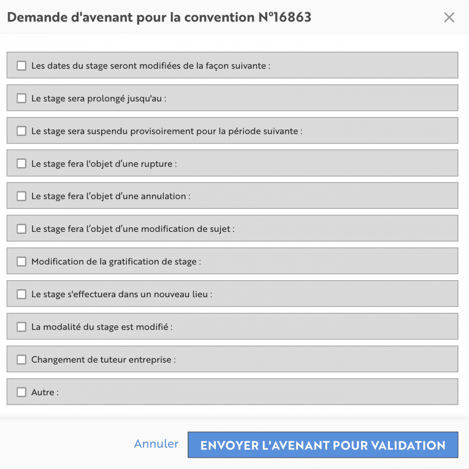 Pour toutes modifications d'une convention de stage signée, la saisie et la signature d’un avenant est obligatoire.