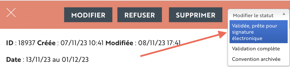 Comme pour chacune des étapes vous avez les choix de modifier, refuser ou supprimer la convention. Si vous devez la valider, il vous suffit de cliquer sur modifier le statut, puis cliquez sur : "Validée, prête pour signature électronique". Vous donnerez alors la main à la scolarité de référence de votre étudiant.