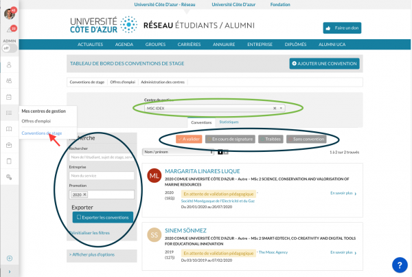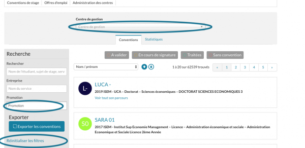 Si les conventions de vos étudiants n'apparaissent pas, réinitialisez les filtres, et faites attention à être dans le bon centre de gestion comme indiqué sur l'image ci-dessous