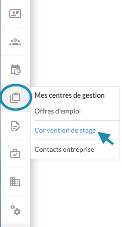 Pour cela rendez-vous sur le bandeau de gauche et cliquez sur mes centres de gestion -> convention de stage.